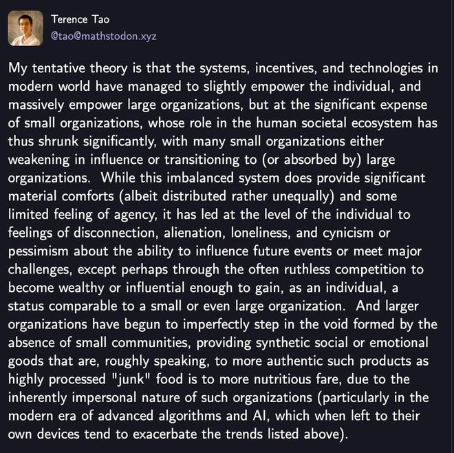 最近,田间奖的获奖者陶兹(Tao Zhexuan)分享了他对当今社会的系统规则的看法,认为当今的社会将大大减少小型组织的重要空间。小型组织逐渐被边缘化,在个人的心理层面上产生严重的负面影响。人们开始感到孤独,疏远和缺乏归属感。我有初步的看法。当今社会的各种系统,激励机制和技术发展略有增强了个人能力,并显着增强了大型组织的力量,但大大降低了小型组织的生活空间。在人类社会的生态系统中,小型组织的作用被大型组织边缘化,整合或取代。这种不成比例的社会结构为人们提供了cmaterial of(尽管舒适程度不公平),但给人们一种有限的感觉控制权,但在个人心理层面上会产生严重的后果。人们开始感到孤独,疏远,缺乏归属感,并对未来产生深刻的阳ot和悲观情绪。大多数人不认为他们可以解决主要挑战,除非他们具有很大的影响力或激烈或残酷的竞争,否则他们可以影响未来或解决主要挑战。这些伟大的组织填补了小社区留下的一些差距,并为人们提供一些综合的社交或情感产品。但是,这些产品在可靠性和亲密关系方面之间的差距与高度加工的“垃圾食品”与真正健康食品之间的差距一样大。这是尤其重要的,不是先进算法和人工智能(AI)的时代,因为伟大的组织自然具有一种冷漠和非人格性。更糟糕的是,如果这些技术可以自由发展,它们倾向于加剧以前的负面趋势。 Terence Chi-Shen Tao于1975年7月17日生于澳大利亚的阿德莱达(Adelaida),是加利福尼亚州的中国数学总监。博士学位并毕业于普林斯顿大学。