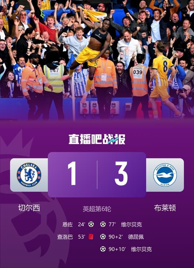 它于9月28日和9月27日,北京时间直播,在2025 - 26年英超联赛的第六轮中,切尔西在斯坦福桥体育场面对布莱顿。恩佐(Enzo)在上半场得分,切尔西(Chelsea)暂时以1-0的布莱顿(Brighton)以1-0击中。查拜(Charaba)直接进入下半场,切尔西(Chelsea)在第二场比赛中获得了红牌,韦布克(Weebck)在停止时间打进了进球,韦布克(Weebck)攻入了另一个进球,最终,切尔西(Chelsea)和布莱顿(Brighton)1-3飞往布莱顿(Brighton),在联盟中连续两次失利。 [重要的比赛比赛]在第24分钟,切尔西中场发起了进攻性,魁北多进行了正确的传球,里斯·詹姆斯(Reese James)向前传球,然后进行了十字架。球被一名防守球员触摸,但仍然落后。恩佐(Enzo)领先球,切尔西(Chelsea)得分为1-0布莱顿(Brighton)。 ↓再次看一下这个球。 ↓在第49分钟,切尔西在后轨上犯了一个错误,桑托斯被他的对手拦截了。迭戈·戈麦斯(DiegoGómez)个人机会。他在方舟顶部与查巴(Charaba)作战,跌落在地。法官当时没有抱怨,所以瓦尔干预了。法官展示了红牌并发送了一张夏罗。 ↓在第77分钟,矿工从左边拿出球,然后传递到背景。威尔贝克击中马,转向球,布莱顿1-1切尔西。 ↓再次看一下这个球。 ↓在90年代和第二分钟,布莱顿从左侧开始进攻,韦弗在后面的队友交叉,将球驶向终点线,Dekupe拿到了球,布莱顿得分为2-1切尔西。 ↓再次看一下这个球。 ↓在90年代和10分钟内,格鲁达(Gruda)在拱门的顶部进行了对角线传球,尼维尔贝克(Nevilbeck)在罚球区打球,抵抗了防守球员的干扰,并利用了萨恩奇斯(Sánchez)的10个手指。布莱顿3-1切尔西。 ↓看这个新的球。 ↓焦点瞬间]切尔西在前场上任意球然后,D进行了罚款,并选择了直接攻击进球,但球被Ville Bleugun救了出来。 ↓在第五分钟,切尔西继续通过前场,库库拉拉将对手的净空球切断了罚球区以外的净空球,脚步攻击了袭击并失去了遥远的职位。 ↓在第十分钟,切尔西有机会在前场上获得任意球。 Neto介入后,Rees James受到了枪击,但被Weirbrugan救出并离开了基线。 ↓在第29分钟,布莱顿越过前场的右侧,但裁判处于拱门的顶部,阻止了进攻球员获得返回通行证。迪特洛塔。 ↓病变时间的前两分钟已经完成,切尔西的一半是在1-0的布莱顿。在第66分钟改变一侧之后,布莱顿从左侧进行了快速进攻,萨奇斯攻击了,拦截了对手的十字架,并与Neto坠毁,Neto返回了Aggre屈服于防守,后者落在了地面上。 ↓在第72分钟,威尔贝克在罚球区找到了一个机会,举起了脚,失去了遥远的职位。 ↓在第87分钟,口味在他清除球时将矿工踢到了头上,后者落入了罚球区。 VAR干预。裁判与视频助理裁判进行了沟通,以确保没有制裁。此外,在Minter摔倒在地之后,双方开始冲突。 ↓受伤时间的下半场是11分钟,整场比赛结束了,切尔西最终以1-3的布莱顿。 [参与和替代信息]特殊声明:“ Netoase”自我中等平台的用户将向先前的内容(如果包括照片或视频)进行收费和发布。该平台仅提供信息存储服务。