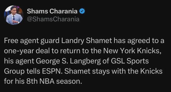 Shams:自由球员Lavy Shemet同意通过一年的合同返回尼克斯。此后不久,邦迪队的记者补充说,谢梅特签署了一项未知协议。老实说,查比可能不得不感谢西蒙斯(Simmons),他似乎不想拒绝将人才带到纽约一年的基本工资协议中。 Chamette生于1997年3月13日,是一名双季节性后卫,高1.93米。他上赛季为尼克斯队效力,并在常规赛中打了50场比赛。他场均得到5.7分和1.2个篮板,投篮命中率为39.7%,平均为1.2个指数。他在季后赛中打过所有替代方案,平均每场2.4分,平均为7.5分钟。尼克斯桥桥在他的个人社交网络上发表了一条信息,欢迎Shamet的回归。凯尔特人队(Tatum Achilles肌腱破裂),起搏器(Halliburton andn Achilles Torn)和美元(Lillard Lillard)。然后,在新季节的东部,RE是冠军竞争力的两支球队:尼克斯和骑士队。但是,骑士队在常规赛中一直被击败,并进入季后赛。今年,东部会议季后赛第二轮的选择很容易被4-1步行者击败,但尼克斯在东部决赛中输了。在这个较低的夏季,尼克斯介绍了前第六克拉克森和阿贝尔,这是将詹姆斯沉浸在巴黎哲学中的人。它非常强大。因此,尼克斯是离开东部会议冠军的新赛季最有可能的球队,在Wild West比赛中表现不错。但是,尼克斯的唯一变量是新教练迈克·布朗(NBA年的两个教练)。您可以拥有前任Thibodeau等培训技能吗? ISI最终更喜欢用武力使用主要球员,并受到质疑,但这给团队带来了。毫无疑问,将进行改进。主框架尼克斯的新季节如下:后卫布兰森,哈特,克拉克森。 Anunobi将桥向前移动。唐斯内部球员,鲁滨逊,阿布塞尔。