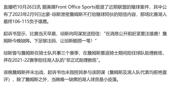 一条透露勒布朗·詹姆斯受伤的短信引发了NBA近年来最大的投注风暴。 “在消息公开之前,现在押注雄鹿!詹姆斯今晚将缺席。押注足够大,让琼斯获利!”这是前NBA球员达蒙·琼斯在2023年2月9日早上给同伙发的短信。当晚湖人队以106-115落败。詹姆斯没有为雄鹿队效力。这条坦诚又贪婪的短信,加上FBI最近公布的起诉书细节,将NBA的博彩暗流彻底暴露在公众面前。震惊篮球界的非法投注和泄密丑闻经过FBI多年的调查逐渐曝光。 10月23日,FBI局长召开新闻发布会,宣布对NBA进行打压。涉及比赛的案件中有30多人被捕,其中包括波特兰开拓者队主教练比洛普斯、迈阿密热火队控卫罗齐尔以及前骑士队球员艾尔斯球员达蒙·琼斯。起诉书揭露了最具争议的案件。 2023年2月9日湖人队对阵雄鹿队的比赛中,琼斯当天早上给球员们发了一条信息:“今晚赌密尔沃基,赌大点。”他已经明确传达同谋詹姆斯·史密斯将缺席比赛,当时官方还没有公布伤病名单。更令人担忧的是,这并不是一起孤立事件。起诉书称,琼斯在2024年1月湖人队与雷霆队的比赛前再次透露了关键球员的伤病情况,并一度要求球员押注10万美元湖人队会输。没想到湖人队赢了,球员们愤怒了,要求琼斯退还参加训练所支付的2500美元。在NBA打了11个赛季的前球员达蒙·琼斯与詹姆斯关系密切。 2005年至2008年,他在詹姆斯手下效力了三个赛季,然后在詹姆斯回到骑士队后担任助理教练。更重要的是,琼斯并不是湖人队的正式员工,但他在2021-22赛季担任湖人队的“非官方助理教练”,但他与詹姆斯的密切关系让他可以在更衣室里闲逛,乘坐球队的飞机,并在2022-23赛季期间帮助詹姆斯的训练。这项特权使您可以访问有关您球队的重要内部信息,包括有关球员受伤的非公开信息。詹姆斯卷入赌博事件,但没有被指控任何犯罪或参与任何非法活动。据TheAthletic报道,一位了解情况的联盟消息人士透露,詹姆斯并不知道共同完成了比赛信息的泄露。湖人队也拒绝对此事发表评论。检方称詹姆斯为“三号球员”,并坚称他没有参与任何阴谋。同样,另一名名为“球员4”的湖人球员(广泛猜测是安东尼·戴维斯)也没有被指控参与方案中的g。 FBI局长表示,调查历时多年,遍及近10个州。其中包括非法体育博彩和帮派操纵扑克游戏,价值数千万美元。这不仅仅是一次赌博行动,更是一个庞大的犯罪网络。除琼斯外,其他被捕的篮球工作人员也面临重罪指控。这个伎俩是从秘密赌场偷钱。该案涉及跨国犯罪组织,罗齐尔的渊源可以追溯到2023年3月23日黄蜂队-佩尔队的比赛中。当时,他在比赛进行不到10分钟后就因脚伤离场。研究人员发现,赌徒经常对罗齐尔的异常数据下注。随着赌博丑闻席卷整个联盟,NBA 官员表示,他们正在“采取尽可能最好的方法”并“认真对待这些指控”,并已开始“对联邦指控进行审查”。联盟还宣布比卢普斯和罗齐尔停赛。这并不是NBA第一次面临博彩丑闻。 2024年3月,多伦多猛龙队的乔泰·波特因赌博指控受到联盟调查,并立即被终身禁赛。经调查,发现该游戏是通过泄露游戏信息而被故意限制的。投注和投注的利润为 21,965 美元。讽刺的是,NBA总裁亚当·萧华却一直支持体育博彩合法化。毫无疑问,这起丑闻对这一战略造成了严重打击。 NBA联盟正面临前所未有的信任危机。这场比赛风波不仅暴露了球员、教练和犯罪组织之间的勾结,也暴露了球员、教练和犯罪组织之间的勾结。可怕的是,粉丝对游戏可靠性的基本信任将会动摇。当内幕消息成为球员在官方渠道之外讨价还价的筹码,当球员受伤成为手段为了赚钱,篮球运动的纯粹性就受到了损害。联盟需要彻底清理,这一事件应该给所有体育联盟敲响警钟。玩耍和跳舞最终会导致自我毁灭。