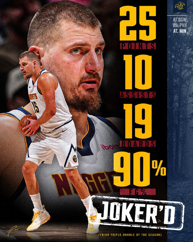 北京时间10月28日,NBA常规赛掘金队客场对阵森林狼队。这是森林狼队连续第二场比赛,爱德华兹因伤缺席。上半场落后8分的掘金队在第三节利用凶猛的进攻将比分追至45-29。掘金队在第四节逐渐将领先优势扩大到15分以上锁定胜局。最终,掘金以127-114击败森林狼,取得二连胜。掘金队数据:约基奇得到25分、19个篮板和10次助攻,连续第三次获得三双。穆雷投进5个三分球,其中第三节得到23分,得到43分和6个篮板,其次是小哈达威20分和沃森12分。森林狼:兰德尔得到24分和7个篮板,麦克丹尼尔斯得到25分,迪文森佐得到12分,康利得到10分,里德得到18分。比赛回顾:掘金队击败太阳队主场133-111取得首胜。在爱德华兹受伤的最后一场比赛中,森林狼队在主场以114-110险胜步行者队。森林狼队本场比赛没有爱德华兹和迪林厄姆。前4分钟掘金队内外开花,以18-6领先12分。森林狼打出一波11-0的进攻高潮,将分差缩小到仅一分。此后掘金将领先优势扩大到26-19,森林狼继续奋力拿分。首节两队得分均超过30分。首节结束,掘金34-30领先森林狼。第二节比赛,森林狼队连续第二节得分超过30分,而掘金队的进攻则大幅下滑。森林狼队在兰德尔和麦克丹尼尔斯的带领下,继续反击追分。直到第二节中段,比分仍保持在45-45。森林狼队继续反击掘金队以51-60慢慢落后9分。掘金队奋起反击拿分,但首节落后12分,以23-35落败。上半场结束,掘金以57-65落后森林狼8分。掘金队前两节比赛得分上双。我记录下来了。约基奇7中6的效率拿到17+7+5分,穆雷则拿到11分。森林狼队有三名球员得分上双,兰德尔和麦克丹尼尔斯得到15分,里德得到10分。半场休息回来后,第三节掘金进攻明显改善。他们第一节拿下45分,比第二节多了22分。第三节穆雷12投7中拿下23分,小哈达威也5投5中拿下15分。他们在第三节合计得到38分,超过了森林狼队的29分总分。穆雷和哈达瓦小y带领掘金首节领先16分,以45-29获胜。第三节结束,掘金以102-94领先森林狼8分。掘金队有三名球员在前三节比赛中得到至少19分,约基奇得到19+12+8分,穆雷得到34分,小哈达威得到20分。麦克丹尼尔斯带领森林狼队拿下25分,得分达到两位数。末节比赛,掘金以104-101落后,仅领先3分。掘金队内外发起10-0的进攻,将领先优势扩大到114-101。森林狼队拿到11分,掘金队连得4分将领先优势扩大到122-107。森林狼队继续反击,但掘金队继续保持两位数的领先优势。沃森的扣篮让他们再次领先15分。森林狼的反击未能力挽狂澜。最终,掘金队击败森林狼队,夺得总冠军。r 连续第二场比赛。双方深入:卡约、戈登、约基奇、布朗、穆雷 森林狼:康利、兰德尔、戈贝尔、麦克丹尼尔斯、迪文琴佐(醉沃厚辰撰文)