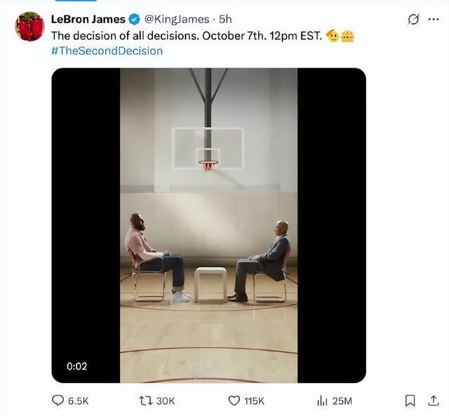 北京时间10月7日,湖人队巨星詹姆斯在社交网络上发布了一条题为“第二次决定”的简短预告,其中表示:“这是一个最高优先级的决定,该决定将于东部时间10月7日中午揭晓。”预告片中,詹姆斯穿着上次直播时“决定”加盟热火时所穿的同一款球衣,引发了关于他退役或离队的猜测,一时间这个主题非常受追捧。北京时间10月8日午夜,詹姆斯的“第二个决定”正式公布。这是某个酒类品牌的促销活动。詹姆斯宣布将与该品牌合作推出联名限量版。这Brand的官方帐户增加了标题:“做出了决定”。第23年的问候。 2025-2026赛季将是詹姆斯职业生涯的第23季。记者反复问詹姆斯何时退休,但从未明确约会。詹姆斯在最近的一次采访中说。 “我很高兴再打一个赛季。我将在新赛季中全力以赴,因为我不知道我的职业生涯何时会正式结束。对我来说,年龄就像一个数字,但这也是一个现实。当我看到周围的很多球员退休时,没有球员可以玩23个赛季的球员。根据Visual China的说法,詹姆斯目前正处于与湖人队的合同结束时,金额相当于5260万美元。还有人猜测詹姆斯将宣布他将进行“退休之旅”。湖人队常规赛对阵爵士乐的最低价格从85美元上涨到445美元据报道,詹姆斯更新了他的社交媒体。一般:北青体育、美酷篮球等。